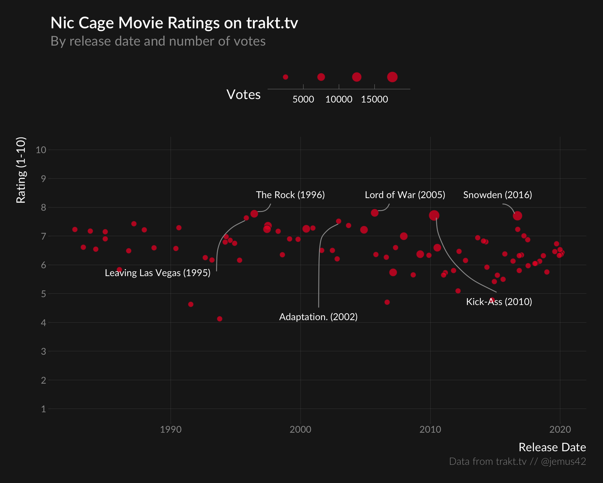 cage_movies%>%mutate(title_label=glue::glue("{title} ({year})"))%>%{ggplot(.,aes(x=released,y=rating,size=votes))+coord_cartesian(ylim=c(1,10))+geom_point(shape=21,alpha=.75,fill="#EA212D",color="#1D1D1D")+geom_label_repel(data=filter(.,rating<4|rating>7.5),aes(label=title_label),size=4,color="white",fill=NA,family="Lato",force_pull=.5,box.padding=4,point.padding=.7,label.padding=.5,label.size=0,segment.color="#999999",segment.curvature=-.25,segment.ncp=2,segment.angle=90,max.overlaps=Inf,max.iter=10000,seed=3236,show.legend=FALSE)+scale_y_continuous(breaks=seq(1,10,1))+scale_size_binned(guide=guide_bins(keywidth=unit(15,"mm"),axis.colour="#999999",aesthetics=c("size","point.size")))+labs(title="Nic Cage Movie Ratings on trakt.tv",subtitle="By release date and number of votes",x="Release Date",y="Rating (1-10)",size="Votes",caption=plot_caption)+theme_trakt()}