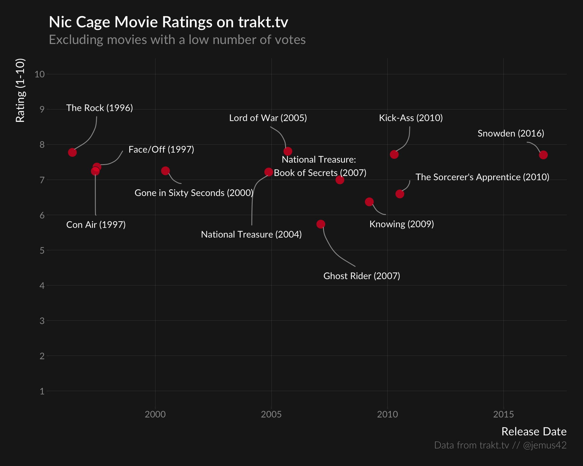 cage_movies%>%filter(votes>5000)%>%mutate(title_label=glue::glue("{title} ({year})"),title_label=stringr::str_replace(title_label,":",":\n"))%>%ggplot(aes(x=released,y=rating))+coord_cartesian(ylim=c(1,10))+geom_point(shape=21,alpha=.75,size=5,fill="#EA212D",color="#1D1D1D")+geom_label_repel(aes(label=title_label),size=4,color="white",fill=NA,family="Lato",box.padding=1,point.padding=.7,label.padding=.5,label.size=0,segment.color="#999999",segment.curvature=-.25,max.overlaps=Inf,max.iter=10000,seed=3236,show.legend=FALSE)+scale_y_continuous(breaks=seq(1,10,1))+labs(title="Nic Cage Movie Ratings on trakt.tv",subtitle="Excluding movies with a low number of votes",x="Release Date",y="Rating (1-10)",size="Votes",caption=plot_caption)+theme_trakt()